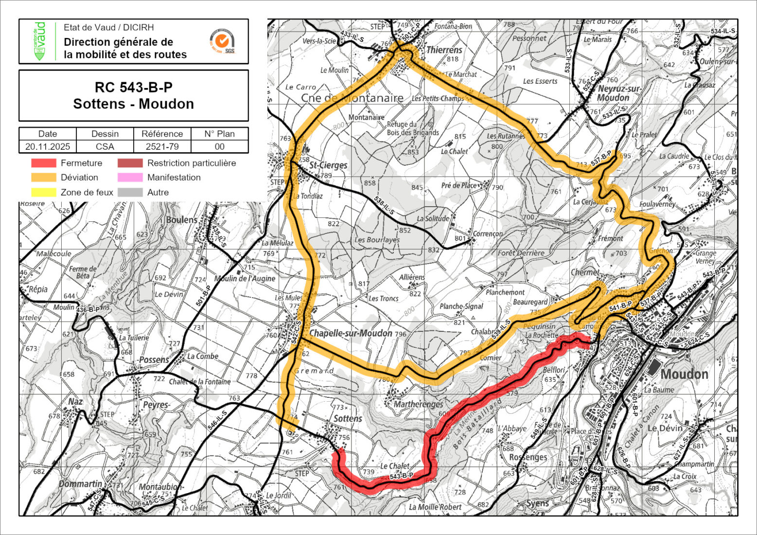 En raison de travaux de sécurisation de la chaussée entre Sottens et Moudon, le tronçon de la route cantonale N°543-B-P, sera interdit à toute circulation du lundi 1er décembre au vendredi 5 novembre (de 8h à 16h) et du lundi 8 décembre au vendredi 12 décembre (de 8h à 16h).
