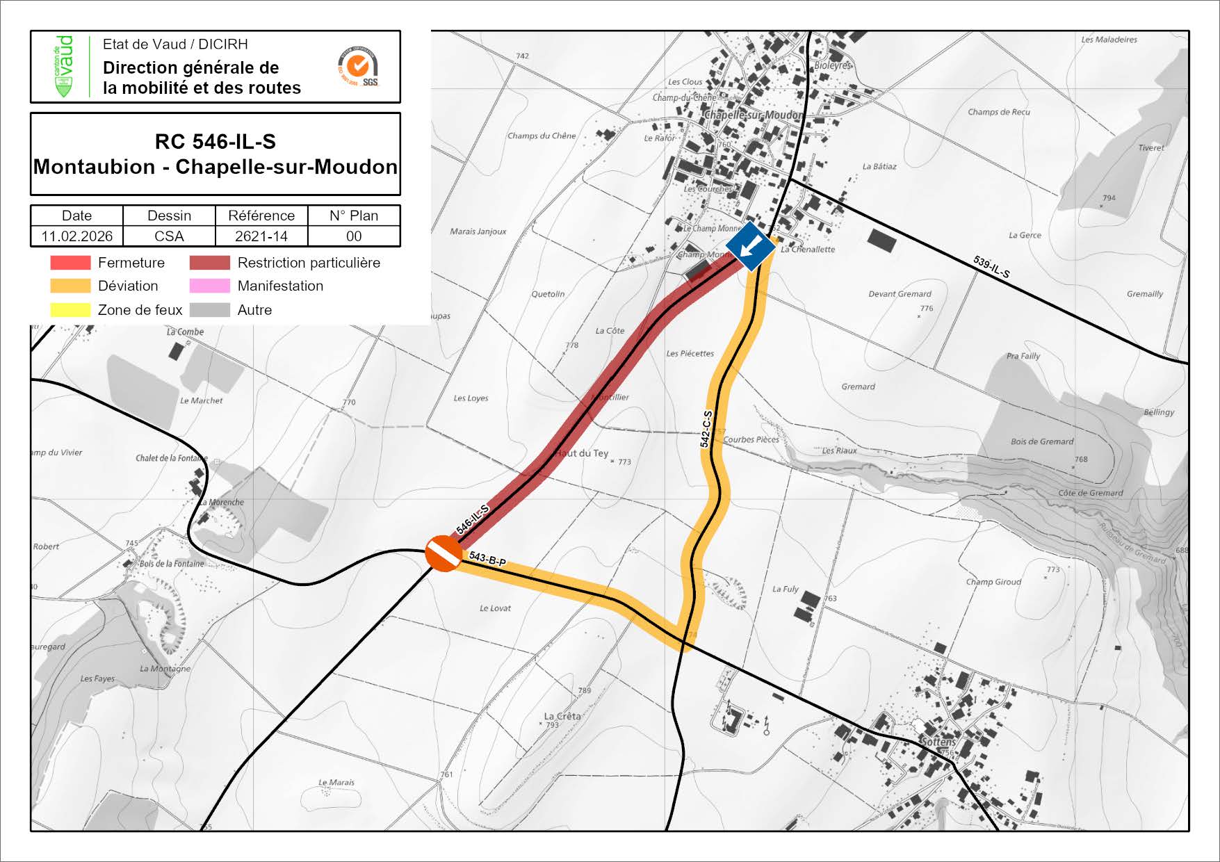 En raison des conditions météorologique et d’une importante dégradation de la chaussée entre Montaubion et Chapelle-sur-Moudon, le tronçon de la route cantonale N° 546-IL-S,compris entre l’intersection avec la route de Peyres-Possens (RC 543-B-P) et la localité de Chapelle-sur-Moudon, est mis en sens unique pour une durée indéterminée.